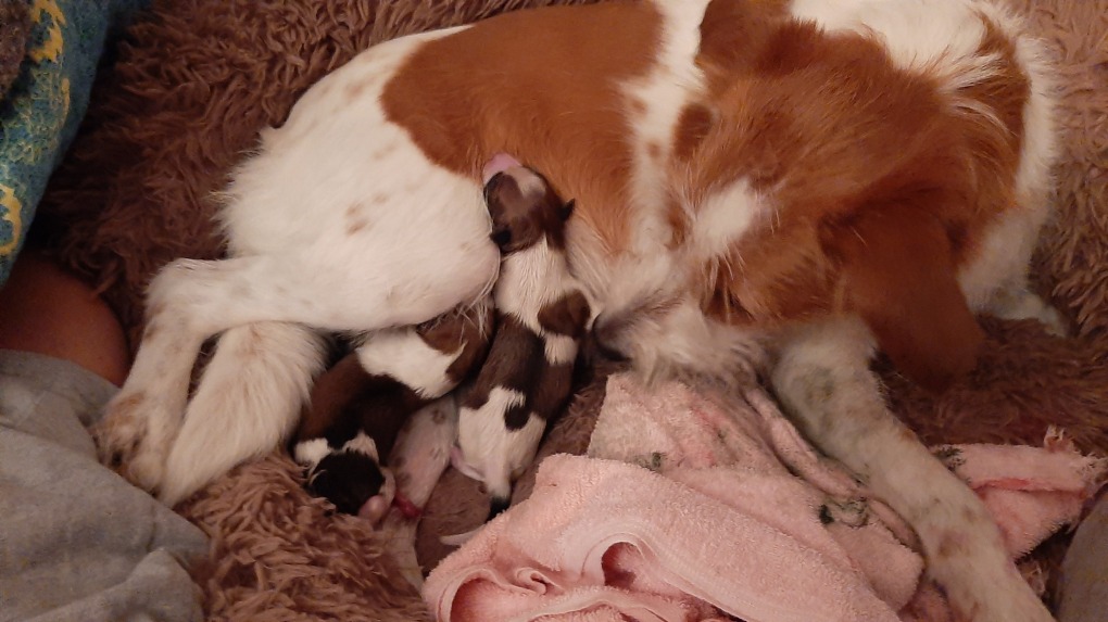 Bis zur Nummer 5 -einer Hündin- hatten wir dann immerhin 32 Minuten Zeit, denn sie kam um 23:57 Uhr. Das machte es für uns auch einfacher, dass man alle Welpen in Ruhe noch einmal anlegen konnte, damit sie die wichtige Erstmilch bekommen. Nouri nahm in der Zwischenzeit ein mit Traubenzucker und Wasser verquirltes Eigelb dankbar an und natürlich auch das nächste Frubiase-Kalzium. |